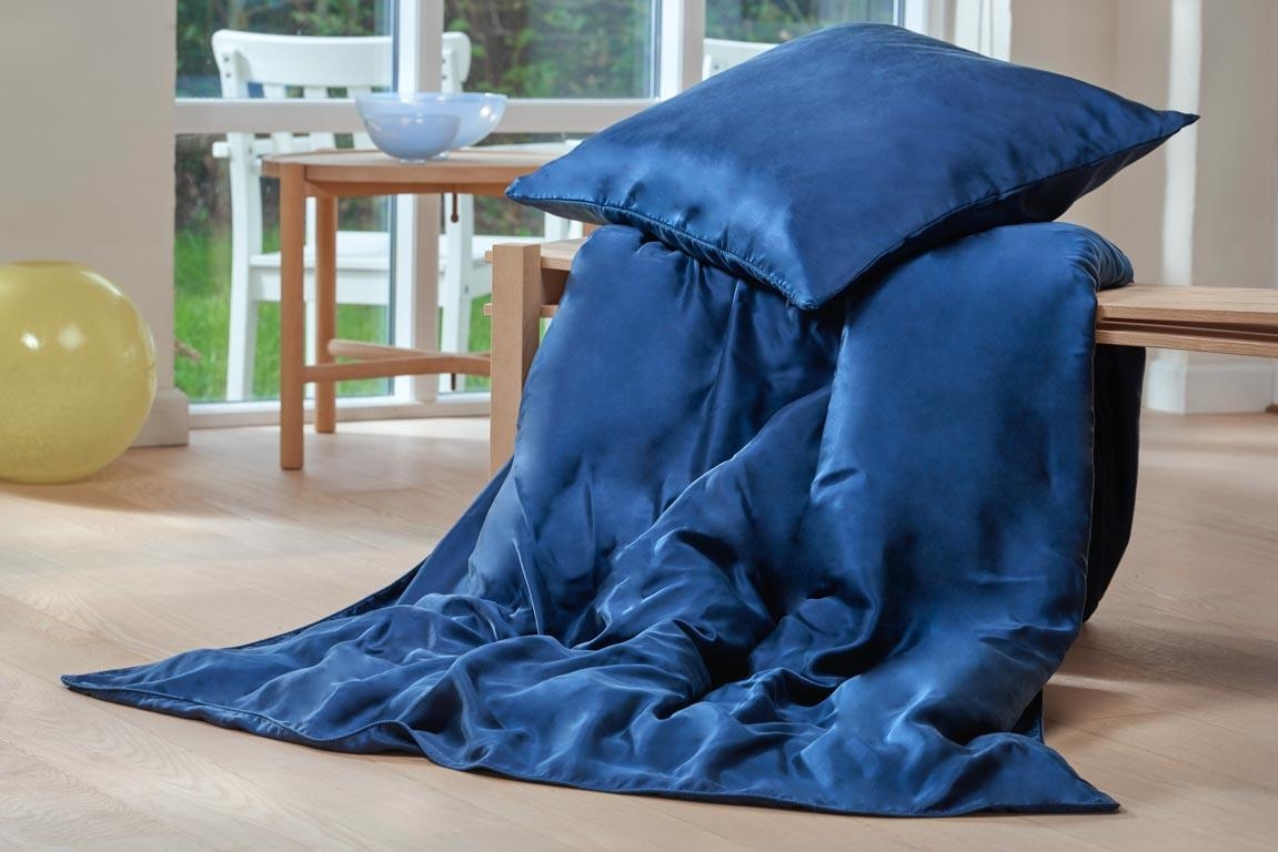 Home » Bedding » Double bedding » King size bedding 240x220 cm Silk bed linen 240x220 cm - Blue bedding - King size - 100% Silk bedding - Butterfly Silk 2 x PillowcasesSave53% Butterfly Silk 1.020,49476,49EURSave 544,- Few in stock Quantity Add to basket See more from: Butterfly Silk Item number: 4001184 Read our bedding guide Explore our extensive collection of sheets Explore our extensive selection of 240x220 duvets Do you have questions about the product? Bedding - 240x220 cm100% mulberry silkExclusive soft bedding Duvet cover: 240x220 cm Pillowcases: 2 pcs. at 60x63 cm Material: 100% Silk Weaving: Silk with 19 momme satin weave Colour: Blue Design: Solid colour Brand: Butterfly Silk Closure: Duvet and pillowcase with zip Washing: 30°(Important to use Enzyme-free detergent) Tumble drying: No Ironing: No Certification: STANDARD 100 by OEKO-TEX® (1176-194DTI) The silk bedding from Butterfly Silk is crafted from the finest mulberry silk, offering a robust silk satin quality with a high momme of 19. For an extra touch of luxury to your bedroom, we recommend a silk bed set. It's ideal for those seeking the utmost comfort, well-being, and a pure sense of enjoyment. The bed linen features an elegant blue colour, offering you the exclusive luxury hotel experience at home. Silk bedding adapts to your body temperature, is moisture absorbent, antibacterial, and hypoallergenic. It is particularly suitable for curly hair and sensitive skin, thanks to its fine and smooth surface. Purchase lightweight pillowcases for your pillows here Silk bed linen can be washed at 30°C on a gentle cycle with enzyme-free detergent. It should be washed separately. This is a delicate and lightweight bed set that requires air drying and cannot be tumble dried. Always remember to turn it inside out and fasten the zip to maintain its quality. Discover our wide range of quality sheets here, including our exquisite silk sheets Return to King size bedding 240x220 cm Customers also bought Goose down pillow "Medium" pillow - 60x63 cm - 3 chambers - Tunø - Quilts Of Denmark Few in stock 380,99190,49EUR Add to basket 2 x Pillowcases Silk bed linen 240x220 cm - Dusty blue bed linen - Set in 100% mulberry silk - By Borg Few in stock 666,99448,99EUR Add to basket 2 x Pillowcases Bedding 240x220 cm - King size - Purple bedding - 100% cotton satin - Borg Living double duvet cover In stock 149,9961,49EUR Add to basket Wool Throw - 100% New Norwegian Wool - Solid Red - 130x200 cm - Arctic In stock 81,9954,49EUR Add to basket Summer duvet 240x220 cm - Nordic Comfort Superior Long-fibred Silk Duvet - king size double duvet In stock 544,49394,99EUR Add to basket Bamboo sheet - Topper fitted sheet 180x200x8 cm - White - 100% bamboo - Sheet for mattress topper In stock 122,4954,49EUR Add to basket Bamboo bedding - 140x200 cm - 100% Natural bamboo - Nature by Borg - Green satin-woven duvet cover In stock 136,4954,49EUR Add to basket 2 x Pillowcases Bamboo double bedding - 200x220 cm - 100% Natural bamboo - Nature by Borg - Rose satin woven double duvet cover In stock 231,49108,99EUR Add to basket Goose down pillow - 60x63 cm - Medium pillow with goose down - 3 chamber pillow - Borg Living In stock 176,9968,49EUR Add to basket Orchid Egyptian cotton guest towel - 40x60cm - White - Luxury towels from By Borg In stock 19,4910,99EUR Add to basket