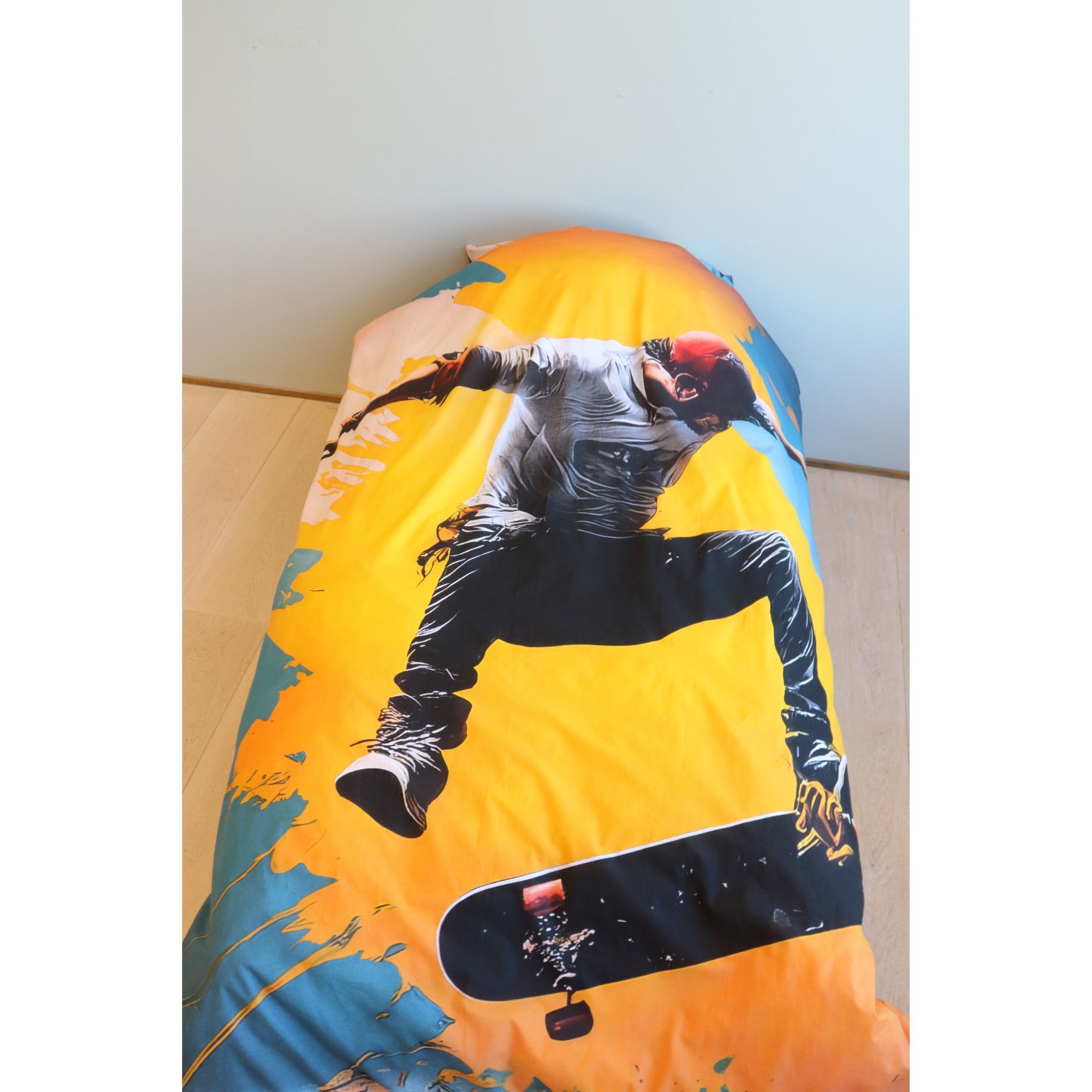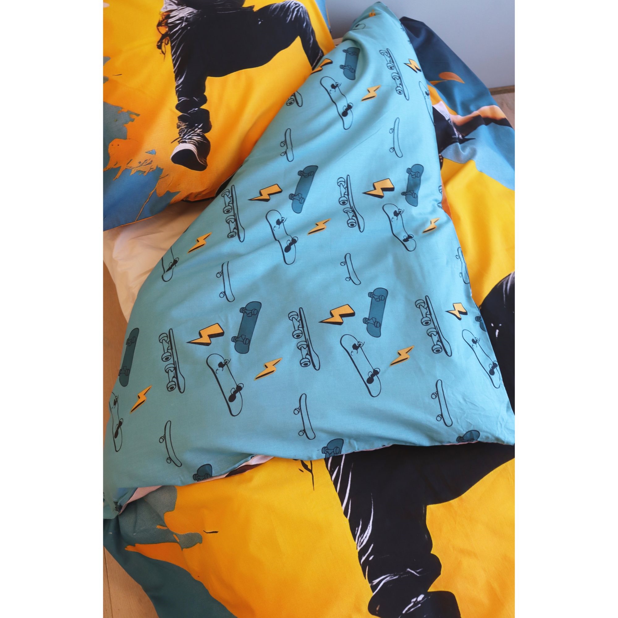 Home » Bedding » Children's bedding » Children's bedding 140x200 cm Skater bedding - 100% cotton - Kids' bedding 140x200 cm - Yellow and blue Save43% Licens 47,9927,49EURSave 21,- In stock Quantity Add to basket See more from: Licens Item number: 2441-1 Read our bedding guide See our large selection of sheets See our large selection of duvets 140x200 Do you have questions about the product? Breathable material that provides a comfortable sleeping environment100% cotton with high comfortReversible design for two looks Duvet cover: 140x200 cm Pillowcase: 60x63 cm Material: 100% soft cotton Colour: Yellow and blue Design: Skater Reversible: - Front: Skater - Back: Full print of skateboards and lightning bolts Closure: Duvet cover with buttons and pillowcase with overlap Wash: 60°C Tumble dry: Yes Ironing: Yes Certification: STANDARD 100 by OEKO-TEX® (17.HPK.23879). Your guarantee that the product is free from harmful chemicals. Skater bedding 140x200 cm – Action-packed design for skater fans This kids' bedding set is made from 100% soft cotton, combining high comfort with durable quality. The pure cotton makes the bedding breathable and comfortable against the skin, giving your child the best conditions for a good and secure night's sleep. When you choose kids' bedding in 100% cotton, you get: Soft and comfortable feel against the skin High breathability for a healthy sleeping environment Durable material that lasts wash after wash Children's bedding needs to withstand a lot. Therefore our cotton bedding can be washed at 60°C, which helps ensure a high level of hygiene. The high wash temperature helps remove bacteria and keeps the bedding fresh and clean. All our kids' bedding in 140x200 cm is OEKO-TEX certified. This is your guarantee that the bedding has been tested and is free from harmful chemicals. When you choose OEKO-TEX certified bedding, you choose safety and security for your child. Make the room extra cool with this striking skateboard bedding. The design shows a skateboarder mid-impressive jump, giving the bedding a dynamic and energetic expression. The strong colours in yellow, blue and orange create a modern street-style look, perfect for children and teens who love skateboarding and action-packed sports. The motif gives the bed a cool and urban look that fits well in a skater-inspired room. Browse for favourites and much more in our large selection of accessories for the children's room Return to Children's bedding 140x200 cm
