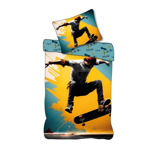 Home » Bedding » Children's bedding » Children's bedding 140x200 cm Skater bedding 140x200 cm - Reversible design with a skater - 100% cotton bed linen Save37% Licens 54,4934,49EURSave 20,- In stock Quantity Add to basket See more from: Licens Item number: 2441-1 Read our bedding guide See our large selection of fitted sheets See our large selection of duvets 140x200 Do you have questions about the product? Soft & breathable100% soft cottonOEKO-TEX® certified Duvet cover: 140x200 cm Pillowcase: 60x63 cm Material: 100% soft cotton Color: Yellow and blue Motif: Skater Design: Reversible - Front with motif of a skater, back with all-over print of skateboards and lightning bolts Closure: Duvet cover with buttons, pillowcase with overlap Wash: 60° Tumble dry: Yes Ironing safe: Yes Certification: STANDARD 100 by OEKO-TEX® (17.HPK.23879). Your guarantee that the product is free from harmful chemicals. Bedding set in 100% soft cotton, featuring a skater motif. With light and breathable cotton threads, this bedding set provides a soft surface that makes the duvet comfortable for the child to sleep with. A durable bedding set with high breathability and absorbency, which will help make bedtime a pleasant experience. Cool bedding set with a skater motif. The bedding set is reversible and features on the front a motif of a skater performing a trick. On the back, there is an all-over print of skateboards and lightning bolts. The bedding set is made of 100% soft cotton, making it durable and highly breathable. The pure cotton quality provides a lovely and soft bedding set that promotes comfortable sleep for the child. The cotton bed linen can be washed at 60° in the washing machine, which also helps maintain a high level of hygiene. The bedding is further produced with OEKO-TEX certification, which guarantees that the set is free from harmful chemicals. Browse for favorites and much more in our large selection of accessories for the children's universe For the child, the bed should be a safe place and all elements together should create soft and pleasant surroundings for the child to find peace in. Therefore, feel free to use the child's interests to create a safe sleeping environment. With us, you can find a large selection of accessories for the bed and children's room, ranging from fitted sheets to duvets, pillows, bed linen and much more, and plenty of products with all the children's favorites on. All elements that can help create the right sleeping environment and room for your child. Here you can find lovely and soft quality fitted sheets Return to Children's bedding 140x200 cm