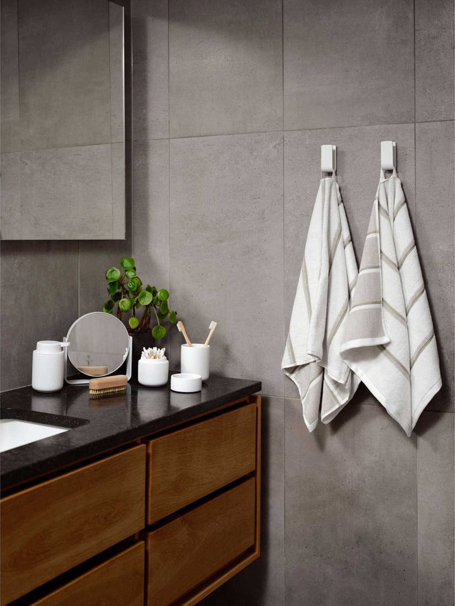 Home » Interior Design » Bathroom accessories » Towel sizes » Towels 50x100 cm Towel - 100% cotton - 50x100 cm - Zone Denmark Sauna - Striped White Zone Great price:20,49EUR In stock Quantity Add to basket See more from: Zone Item number: 37608-3 See our wide selection of bath mats for the floor See our selection of towel packs See our wide selection of bathrobes for the whole family Do you have questions about the product? High absorbency which makes the towel dry quickly Soft and plush quality that feels pleasant against the skinDouble-sided design - two looks in one towel Size: 1 pc. 50x100 cm Type: Towel Weight: 600 g/m² Quality: 100% cotton Color: White, Soft Grey and Eucalyptus Textile type: Cotton Series: Sauna Brand: Zone Denmark Wash: 60° Tumble dry: Yes Certification: STANDARD 100 by OEKO-TEX® (2668CIT CITEVE). Your guarantee that the product is free from harmful chemicals. Towel 50x100 cm - Sauna from Zone Denmark Add character and luxury to your bathroom with this stylish Sauna towel from Zone Denmark. The graphic design with stripes in subtle colours creates a modern and personal expression. The towel is ideal as a slightly larger hand towel at the basin, where it quickly and efficiently dries hands after use, or as a smaller towel to dry yourself with after a bath. See all towels 50x100 cm here The towel is made from 100% cotton with a substantial quality of 600 g/m², ensuring a soft, plush and luxurious feel against the skin. The double-sided design gives you two different looks in one towel. Each side has its own dominant colour so you can easily vary the look in your bathroom. The high cotton quality provides good absorbency and is pleasant to dry yourself with after a bath. The design is inspired by the clean lines of classic saunas and combines functionality with a modern graphic expression. The towel is OEKO-TEX® certified, which guarantees that the product is free from harmful chemicals and safe to use on the skin. We always recommend that brand new towels are soaked in cold water before the first wash - this improves the towels' absorbency. Additionally, the towels can advantageously be tumble-dried to preserve their loft and softness. Read all about towels in our towel guide here Zone Zone Denmark embodies Scandinavian design, where simplicity, aesthetics and functionality go hand in hand. The brand creates modern and innovative home products in close collaboration with renowned Danish designers. The range is extensive and includes both home accessories and bathroom accessories. With a minimalist and timeless expression, Zone Denmark manages to combine design and function in products that make everyday life more practical. See the full selection from Zone here Return to Towels 50x100 cm