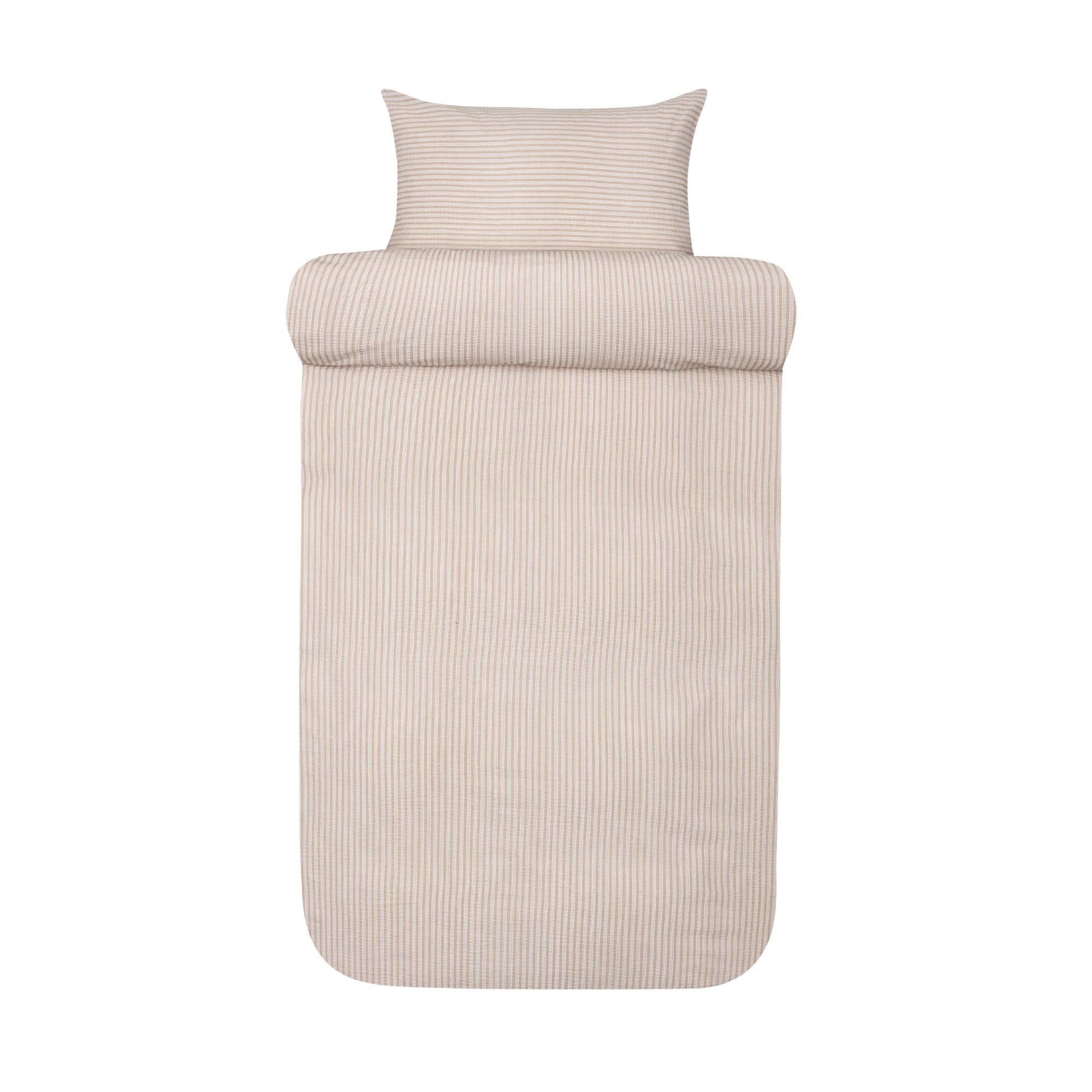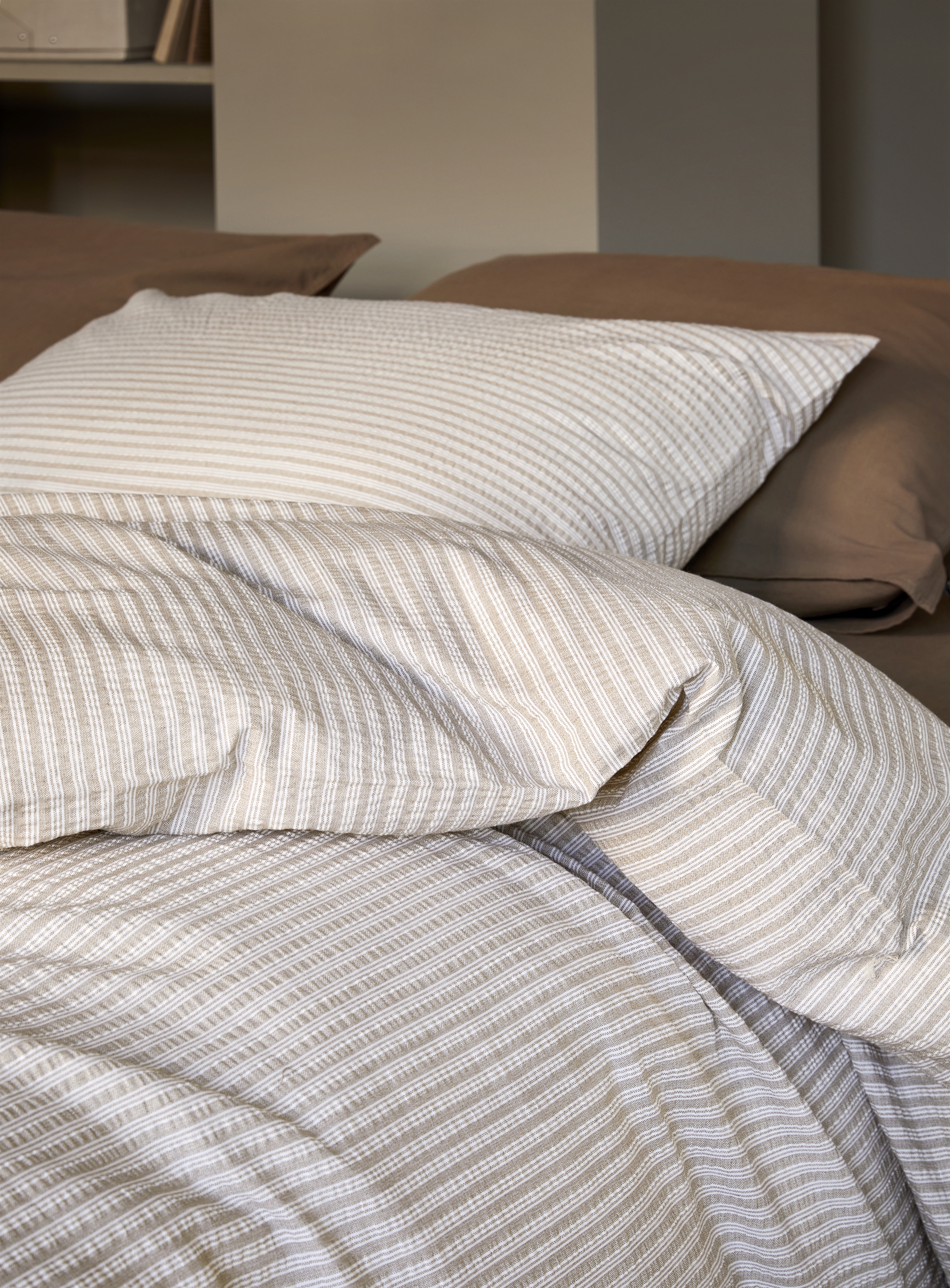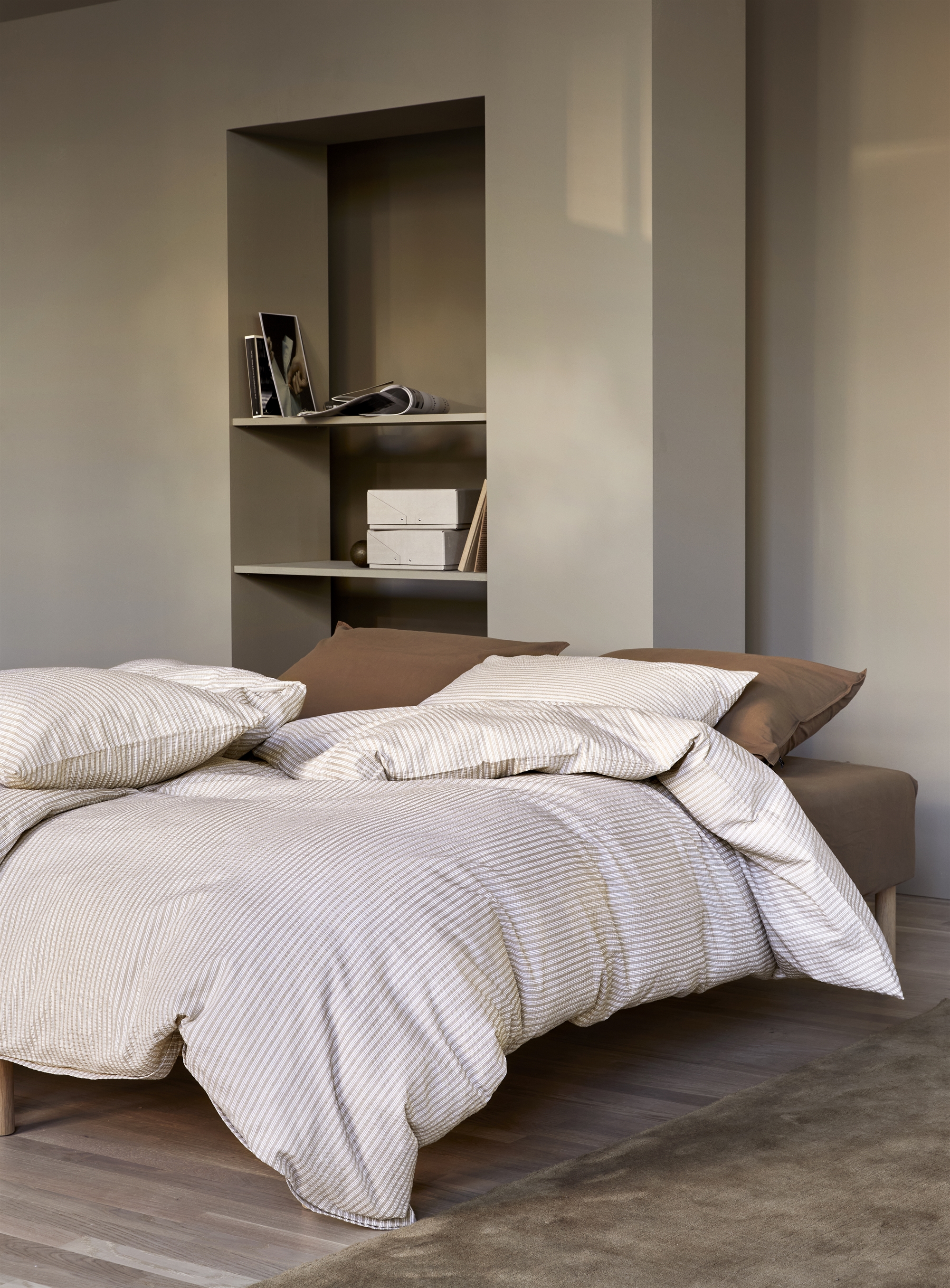 Home » Bedding » Single bedding » Single bedding 140x200 cm Woven crepe bedding 140x200 cm - 100% soft cotton - Brown with stripes - Seersucker bedding - Slumre Høie Of Scandinavia Save16% Høie Of Scandinavia 81,9968,49EURSave 14,- In stock Quantity Add to basket See more from: Høie Of Scandinavia Item number: 8351-1 Read our bedding guide See our large selection of sheets See our large selection of duvets 140x200 Do you have questions about the product? OEKO-TEX® certifiedSoft, light and airyExclusively airy woven crepe Duvet cover: 140x200 cm Pillowcase: 1 pc. 60x63 cm Material: 100% soft cotton - Woven crepe Weave: 200TC seersucker (Thread count = number of threads per square inch) Color: Brown with stripes Design: Slumre caramel brown Brand: Høie of Scandinavia Closure: Duvet cover with zipper, pillowcase with envelope closure Wash: 60° Tumble dry: Yes Ironing: No Certification: STANDARD 100 by OEKO-TEX® (19.HIN.85821). Your guarantee that the product is free from harmful chemicals. The extra-fine cotton threads create a delicate crepe weave. Perfect if you love the soft and crisp feel. In woven cotton crepe made from 100% cotton, unique air pockets are created in the weave. The crepe weave is warm in winter and cool in summer, and gives a soft and crisp crepe sensation wash after wash. A classic that does not require ironing. This striped Slumre bedding is produced from 100% soft cotton using the seersucker weaving method, also called cotton crepe. This weave creates the wrinkle effect and forms small air pockets in the material, which makes the bedding feel light, airy and often cooler than other types of materials. In summer the bedding will feel airy, and in winter you will notice the warmth from the soft cotton, which is a unique advantage this wonderful combination of material and weave provides. The bedding set should not be ironed, as it has its air pockets in the weave itself. Bedding with this weave type is especially good for those who sometimes feel warm at night, as the bedding can add increased breathability and high absorbency. Easily buy pillow covers for your extra pillows here Freshen up the bed and bedroom with a beautiful and luxurious bedding set like this. Also take the opportunity to ensure maximum sleeping comfort by adding a new soft sheet of high quality. You can find our large range of quality sheets here Høie is a Scandinavian brand that stands for tradition combined with innovation. The company has existed since 1850 and over the years has helped shape and develop Scandinavian textiles and designs. Bedding from Høie is everyday luxury that everyone deserves. Return to Single bedding 140x200 cm